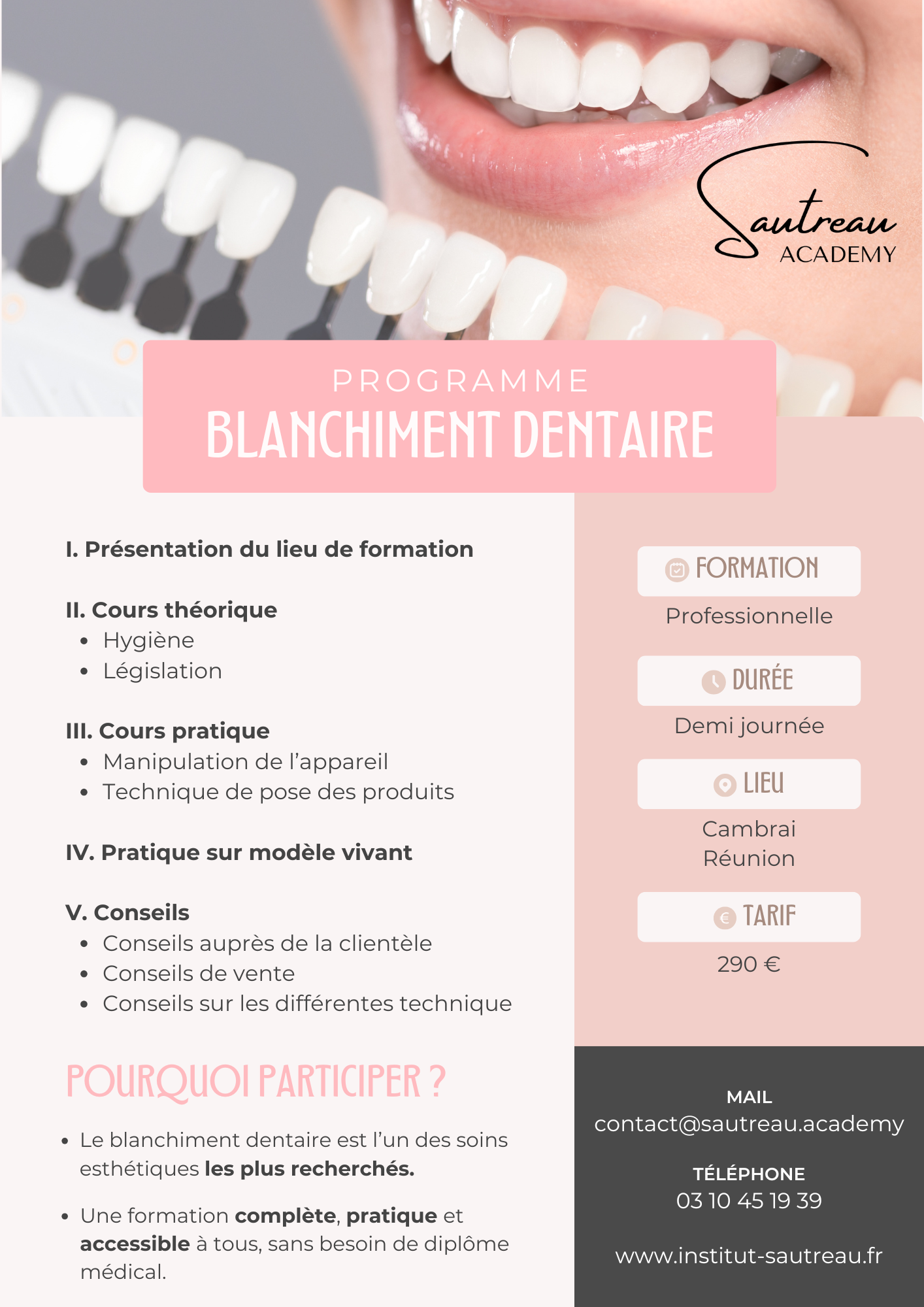 Pour répondre à cette demande croissante, Sautreau Academy propose une formation professionnelle en blanchiment dentaire, accessible à tous les passionnés de l’esthétique souhaitant élargir leurs compétences ou se lancer dans une activité tendance.
